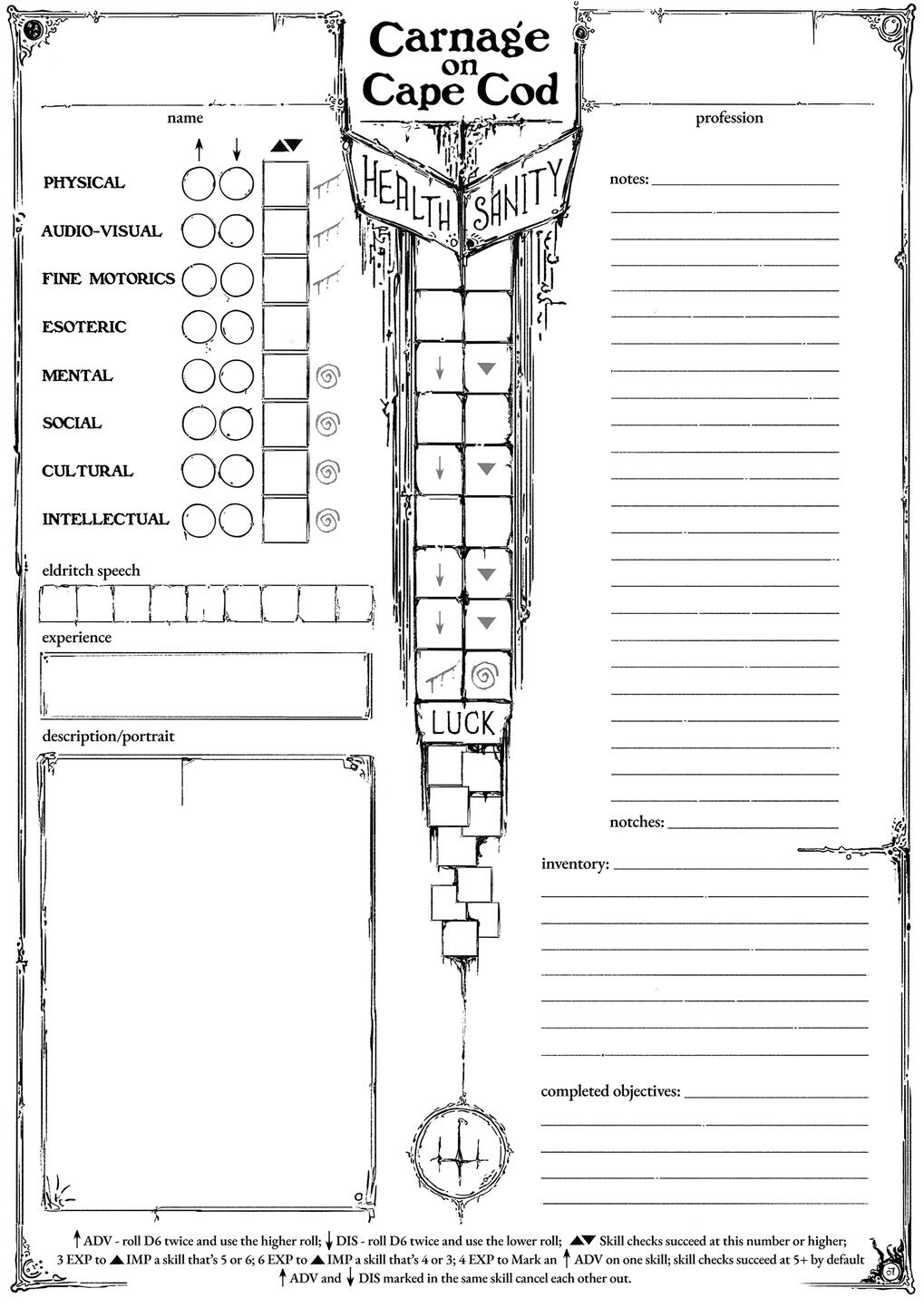 ● Sanity-based: Mental, Social, Cultural, Intellectual. In case your Sanity drops to the lowest bracket, these skill checks will be automatic failures, with no amount of Luck to save you.Any 5 or 6 rolls are considered successes at the beginning of the story. Until you better your chances at certain skills or spend your Luck points to nudge the fates your way.You will be able to affect those skills with modifiers- Advantages and Disadvantages (roll twice, take the better/worse roll), Improvements and Impairments (increase/decrease your chances of success by lowering/upping your skill number).