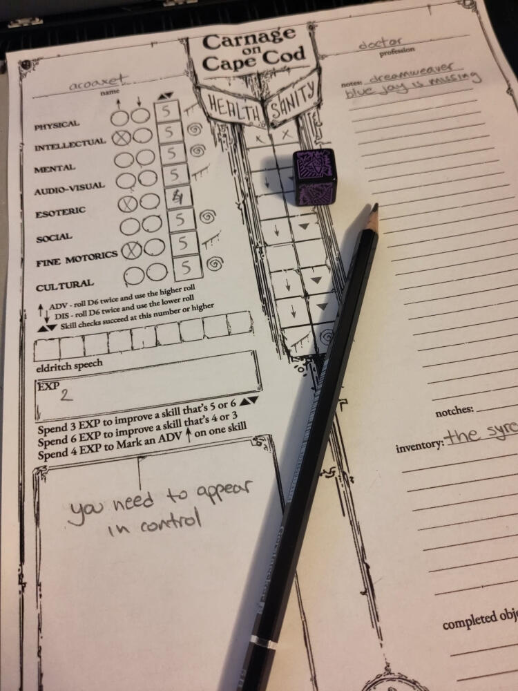 Fishmalks from Vampire the Masquerade come to mind, as do some portrayals of the bouts of madness from Call of Cthulhu.But I found that having such elements in a game while suffering from various mental disorders can be therapeutic. I lean towards games that have sanity or stress bars, because I’m certain that I have one in my irl ui/ux.Carnage on Cape Cod is a game of anxiety and spiraling down the hole of murder, ritual, mass hysteria, monsters, and devils. It has a Sanity bar. And it will often drop.But there are also ways of managing it.You can alleviate stress; drink a warm cup of tea or coffee, look at the ocean (before it becomes terrifying), take a bath, read a relaxing book, feel better, even if just temporarily. Sometimes, temporary relief is all that we need before facing something terrible.You will not be gone if your Sanity drops to the lowest space on your character sheet. This will only mark certain actions (of the mind) as automatic failures, given your distress in taking part in them.